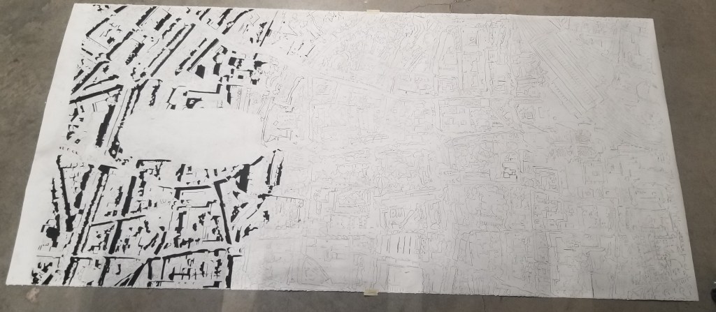 Having completed Shangri-La and been quite pleased with the outcome, I decided to try against an aerial piece. This time I chose an urban scene: Cologne, Germany. Specifically, Cologne Cathedral. “Kolner Dom” follows the same format at Shangri-La at 9′ X 4.5′, with a kneeling spot towards one end. As with Shangri-La, I began by tracing the general forms of the landscape from a projection. However, because of the high detail in the cityscape, it took almost 4 or 5 times as long to do so.