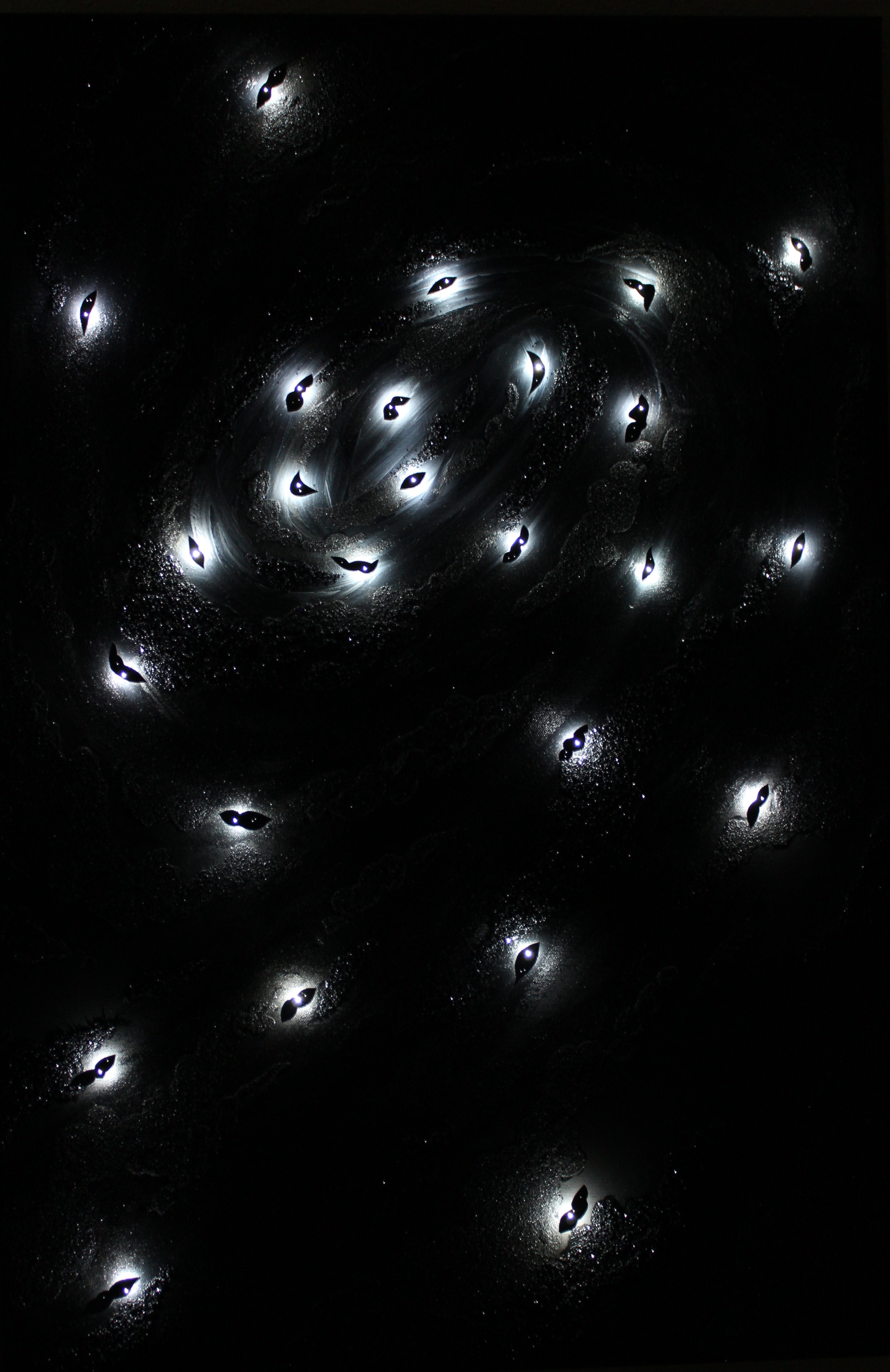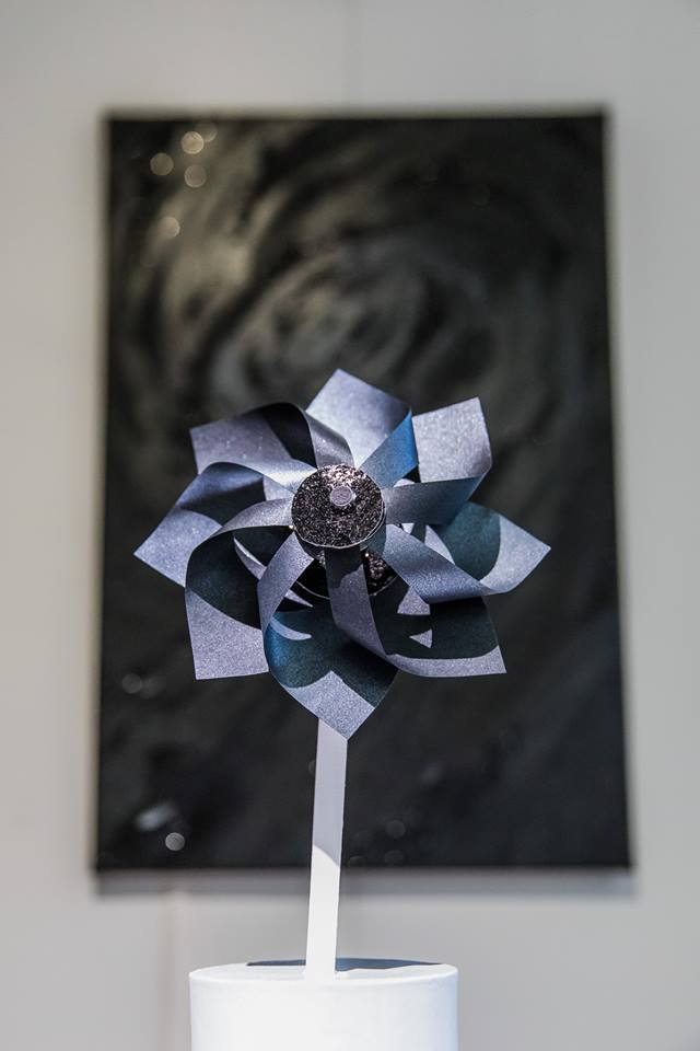 Breath & Dust, installation of canvas which lights in response to viewers blowing on a pinwheel; acrylic paint, sand, and glitter on canvas, Arduino, LED lights, paper, balsa wood, cardboard, glue; 24” X 48” canvas and 4” X 30” X 4” pinwheel, 2018 (NFS)