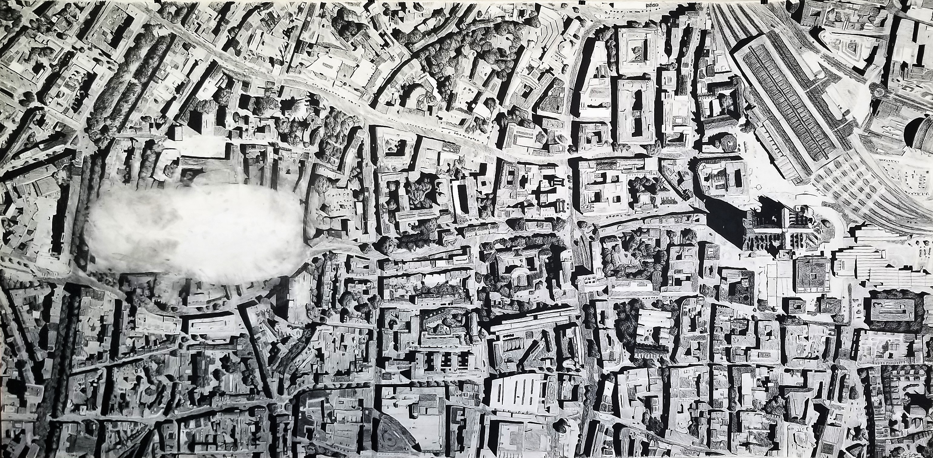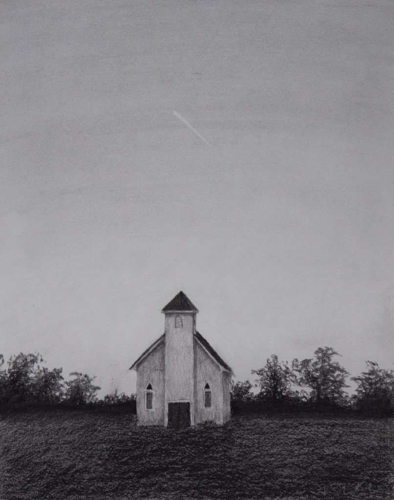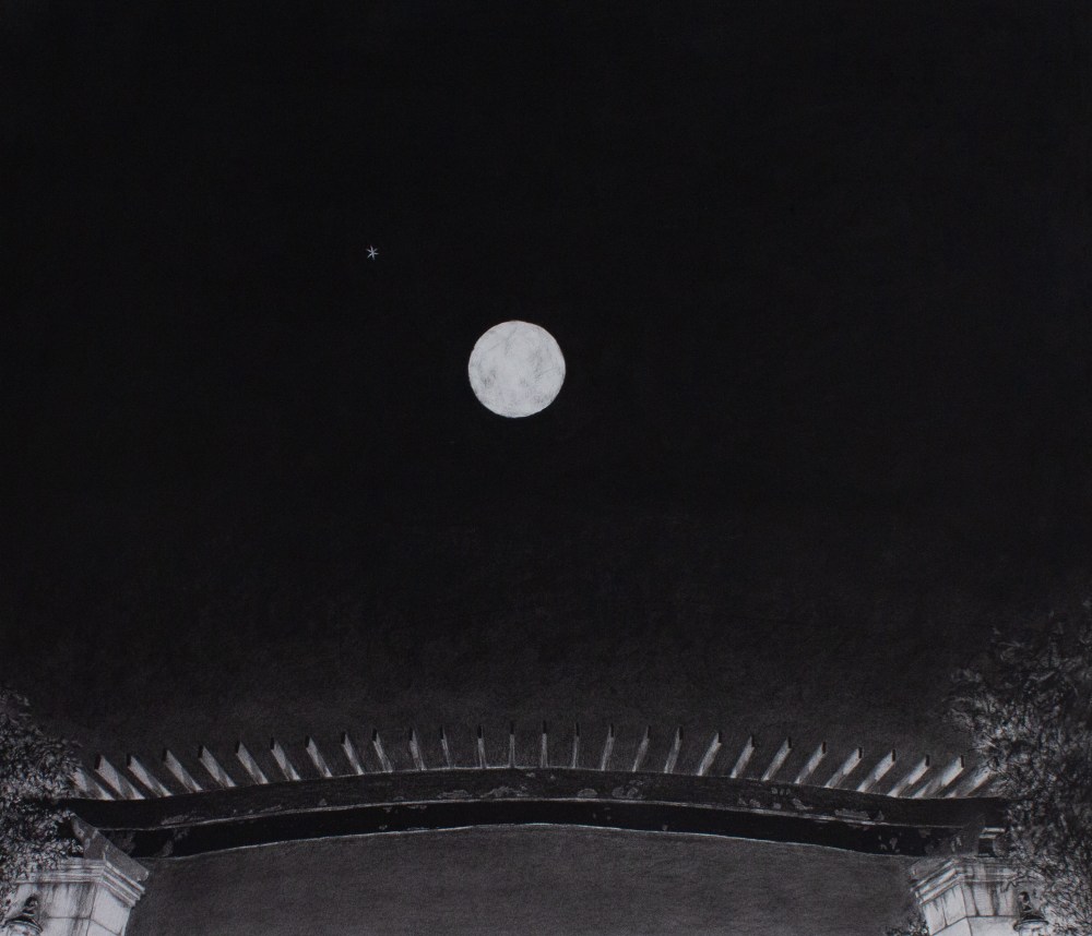 Mars over LaSalle, charcoal on paper, 26.5” X 22.5”, 2020Airstream over the Chapel, charcoal on paper, 11” X 14”, 2020